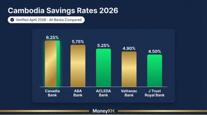 Cambodia savings account interest rates 2026: ABA Bank offers the highest USD savings rate among major Cambodian commercial banks at 4.5–5.0% per annum for standard savings accounts, tiered by balance. Canadia Bank leads fixed deposit rates at 6.25% p.a. for 12 months and 6.50% p.a. for 24 months USD — above ABA and ACLEDA at these terms. KHR savings accounts at all major banks carry a 1–2% NBC-mandated premium above USD equivalents to incentivise de-dollarisation, with ACLEDA and ABA both offering KHR savings at 5.5–7.0% p.a. These rates are significantly higher than equivalent accounts in the US, UK, Singapore, or Malaysia — reflecting Cambodia’s dollarised economy and the National Bank of Cambodia’s deposit rate framework. All rates on this page are verified directly with each institution and updated quarterly.